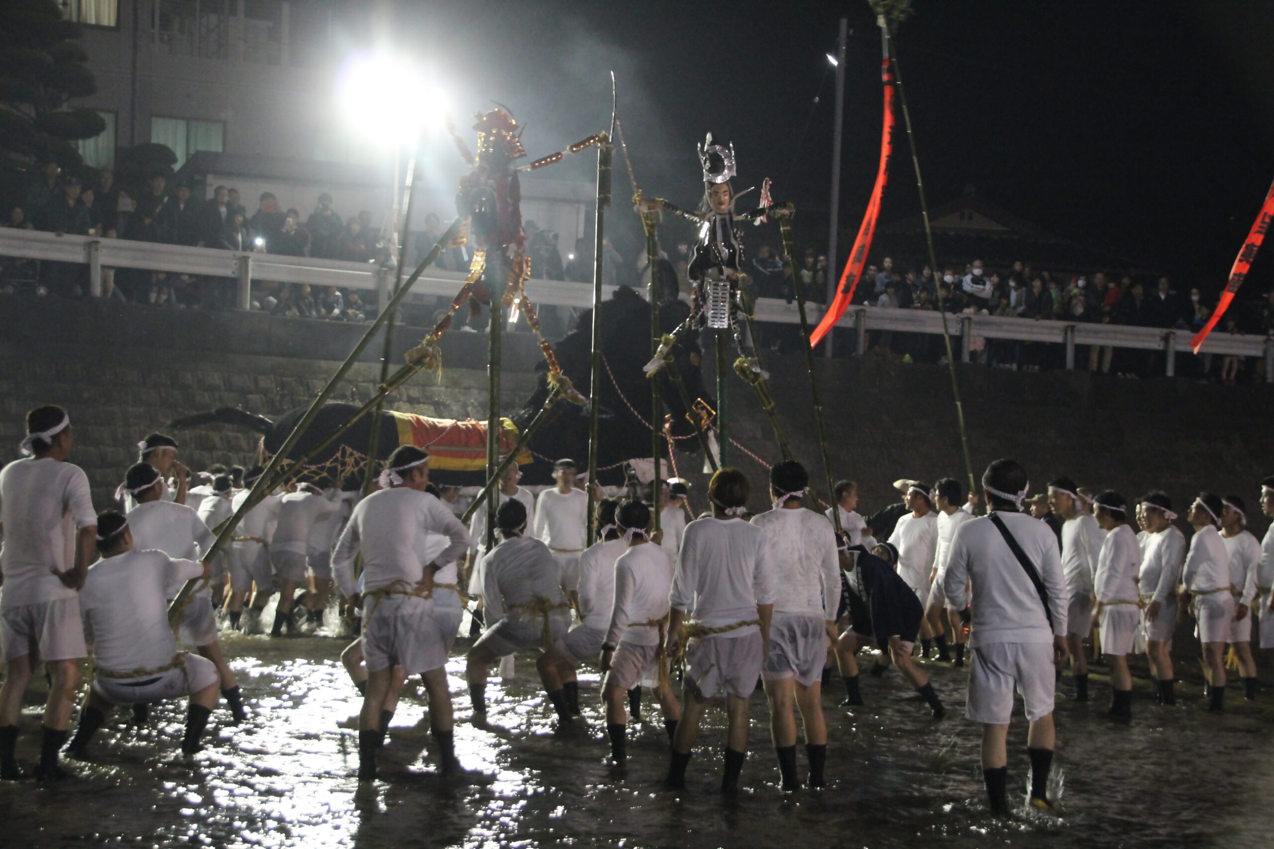また、夜の部では松明を灯して巨瀬川の中で合戦を行います。