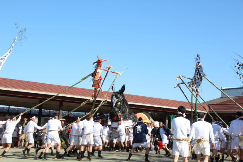 竹とわらで作った馬を30数名の若者が担ぎ、人形が鉦や太鼓にあわせて会場を練り歩きます。